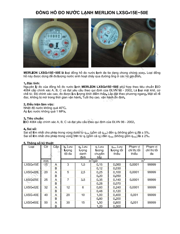 1. Đặc tính: Nguyên lý đo của đồng hồ đo nước lạnh MERLION LXS-15E~50E phù hợp theo tiêu chuẩn ISO 4064 cấp chính xác A, B và đạt yêu cầu theo qui định của ĐLVN 96 - 2002. Độ chính xác cao, đo được lưu lượng khởi điểm thấp. Lắp đặt theo phương ngang. Mặt số rễ đọc, không bị mờ trong thời gian vận hành. Tuổi thọ cao, vận hành ổn định.